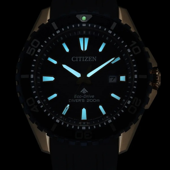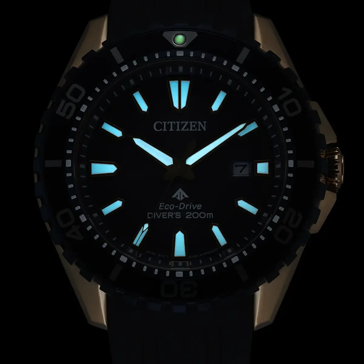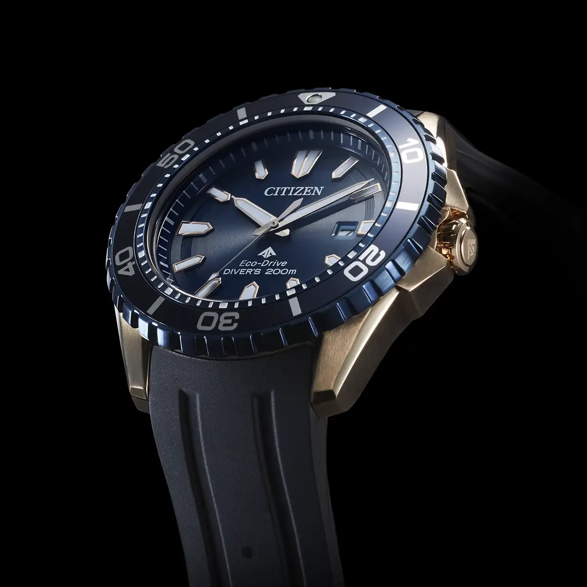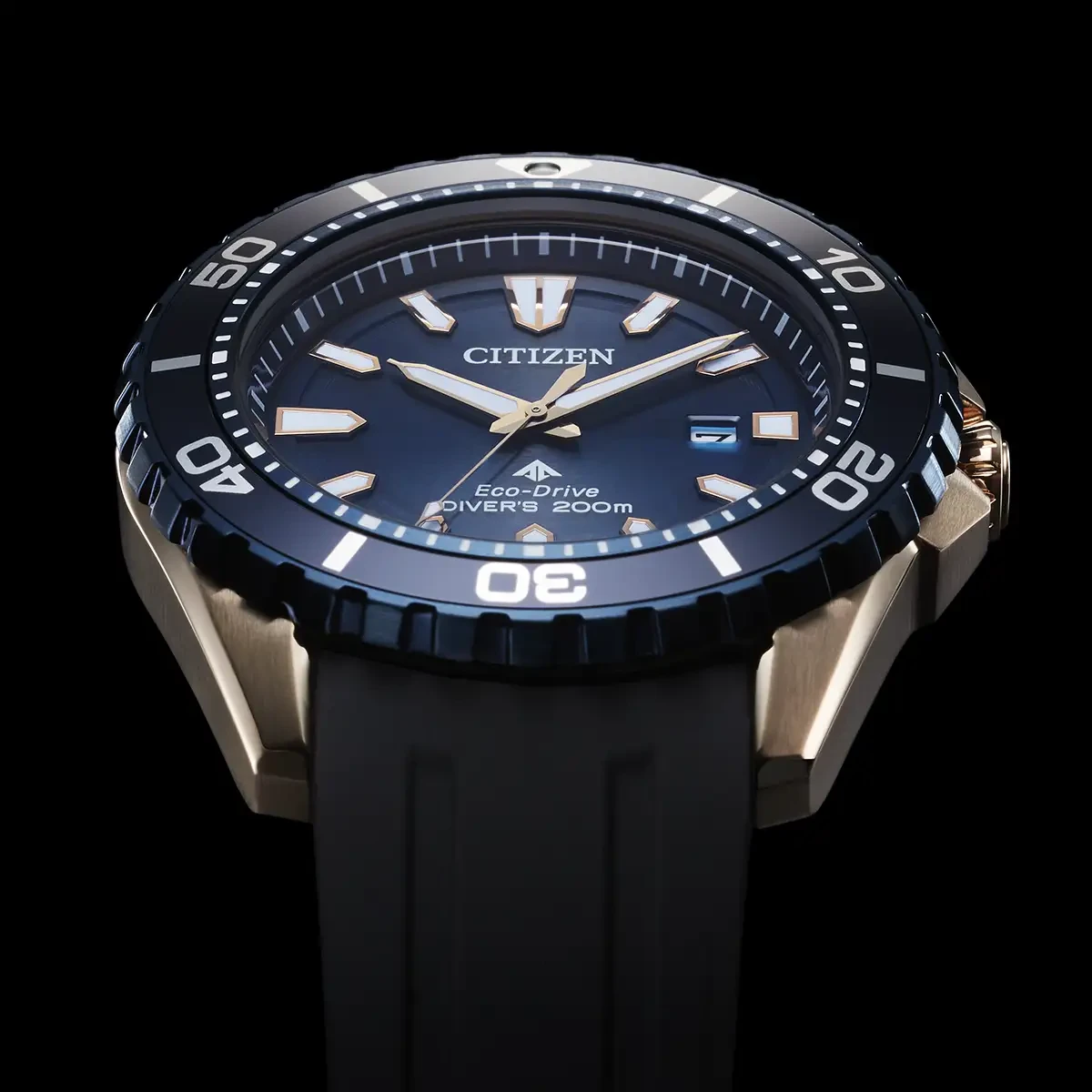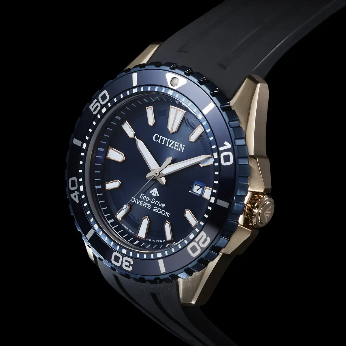 From the Promaster collection, this ISO Compliant diving watch is the perfect blend of style and function. Styled with a rose gold-tone stainless steel case and black polyurethane strap with a blue bezel and matching dial with luminous hands and markers for easy readability. Additional features include a one-way rotating elapsed-time bezel, screw-back case, screw-down crown and water resistance to 200 metres. This 44mm timepiece is completed with Eco-Drive technology, sustainably powered by any light and never needs a battery.