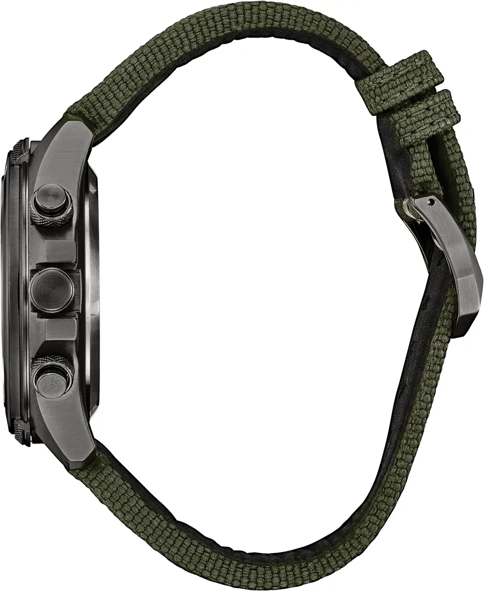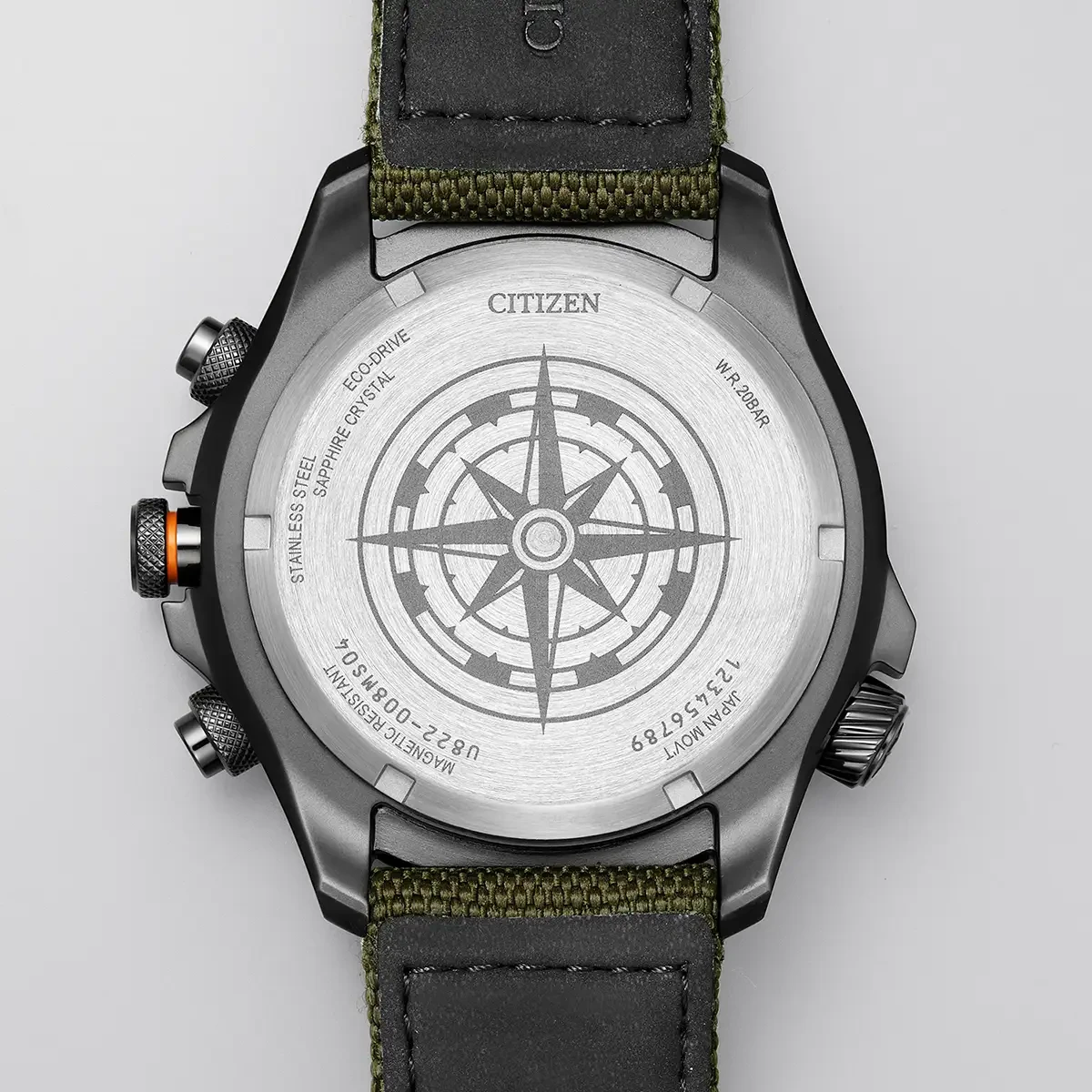 The latest adventure-ready timepiece from Citizen’s Promaster Land series. This new timepiece is packed with features & ready for action, featuring a grey-tone stainless steel case, with a sporty nylon Cordura® strap. On the dial, luminous hands and markers stand out against a forest green background for high legibility, while a rotating compass scale surrounds the look, and the digital-analogue display ensures complete focus on the mission. The watch's advanced capabilities include a world-time display, chronograph, alarm, light level indicator, perpetual calendar, power save mode, charge level display, and summertime mode. The Promaster Land is sustainably powered by any light with our proprietary Eco-Drive technology, so it never needs a battery. Water resistant up to 200 metres.