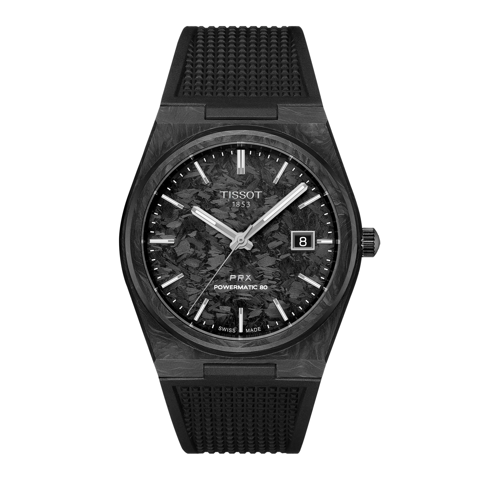 This PRX Powermatic 80 features a 40mm forged carbon case. Thanks to this innovative material, each piece is lightweight, durable but most importantly unique. It is designed for optimal performance in demanding conditions, empowering ambitious individuals to push their limits.