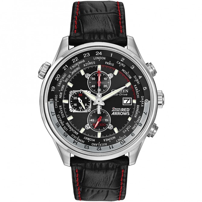 Take to the skies with this chronograph from Citizen’s RAF Red Arrows Collection. Styled in stainless steel with a black dial featuring red and white accents, a black leather strap with red stitching, 1/5 second chronograph and 12/24 hour time. The official Red Arrows insignia appears on the watch caseback. Featuring Eco-Drive technology – powered by light and never needs a battery.