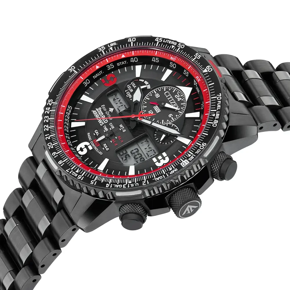 This Citizen Limited Edition Red Arrows Skyhawk A-T watch features a grey-ion plated case & bracelet paired with a black dial featuring the Red Arrows logo. Thanks to its radio-controlled atomic clock synchronisation technology, this watch keeps incredibly precise time. Additional features include a 1 second chronograph, world time in 43 cities, perpetual calendar, alarm, power reserve indicator, water resistance to 200 metres and Eco-Drive technology; powered by light, any light and never needs a battery.