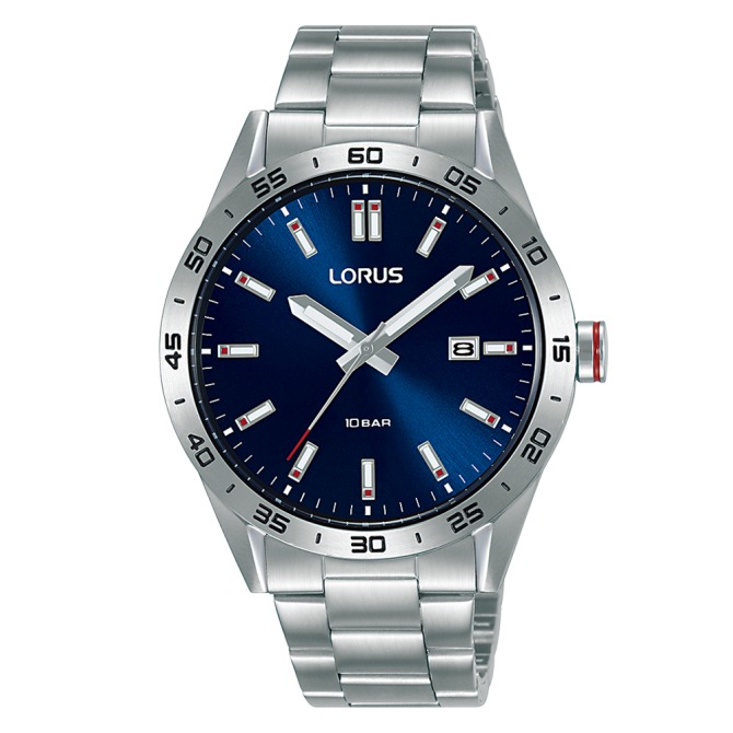 Semi-luminous silver-coloured hands and baton markers accented with red highlights enhance the blue sunray dial’s visual appeal but also contribute to its easy legibility.