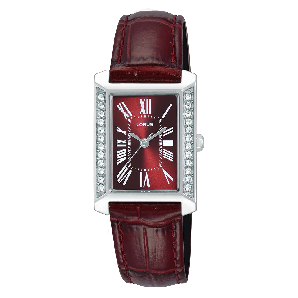 This timepiece is designed for classic luxe style. Its rectangular dial showcases a striking red sunray effect while the silver-coloured hands and Roman numeral hour markers complement the overall aesthetic, creating a harmonious and refined look. Paired with a dark red strap for an all over standout timepiece.