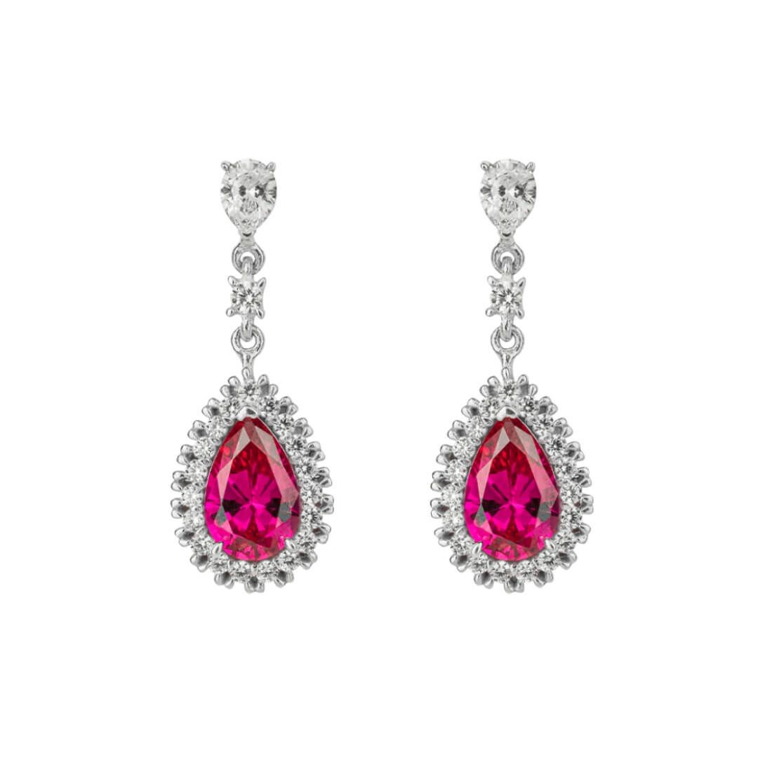 Silver & Red CZ Teardrop Earrings with Pave Surround