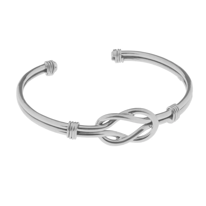 An unusual but lovely sterling silver bangle crafted by Tianguis Jackson who take their inspiration from over a century of Mexico's silver crafting heritage. This bangle has a contemporary knotwork design that ties both halves of the bangle together, with a small piece of wound silver on each side of the knot.