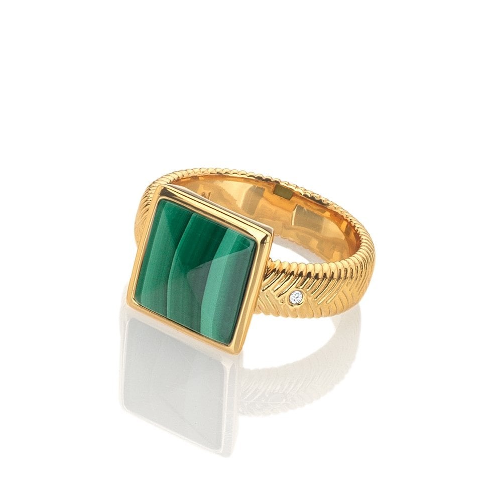 Before I started working on the design of this collection with Hot Diamonds, I didn't wear too many gemstones as I preferred a simple gold finish. Now, I have completely changed my mind, and I think breaking up the gold with a splash of natural gemstone creates a stunning overall look, and you seem to agree as our Pearl and Malachite designs are amongst your most-loved! This jewel is crafted from genuine Malachite, 925 sterling silver, a real hand-set diamond and 18ct gold plate. You need it in your life! The width of the top section of this ring measures 11mm.