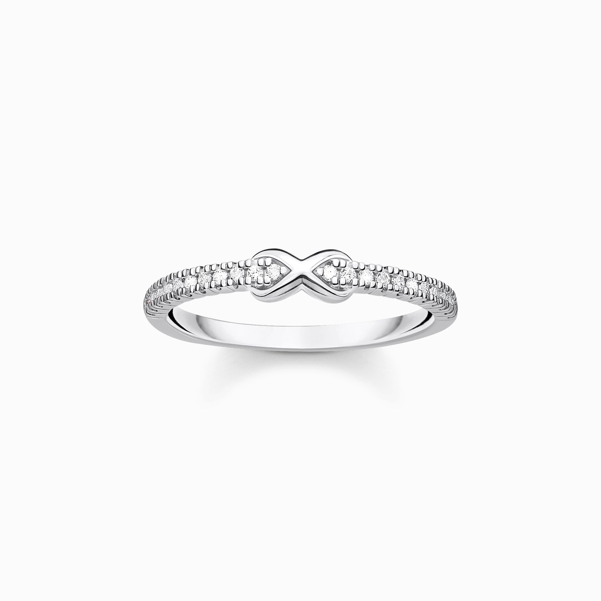 A piece of jewellery to dream about! Show self-love or a loved one endless affection by selecting our infinity ring! Elaborately handcrafted from high-quality 925 Sterling silver, the ring for women impresses with a fine appearance and its many sparkling white zirconia stones set in pavé. Combined with some other rings from the Charming Collection, cool Ring Stacking-Styles are created. Also as individual piece on the finger, this ring sparkles wonderfully & thereby, attracts all eyes. Get this silver ring right away and be inspired by its romantic spirit.