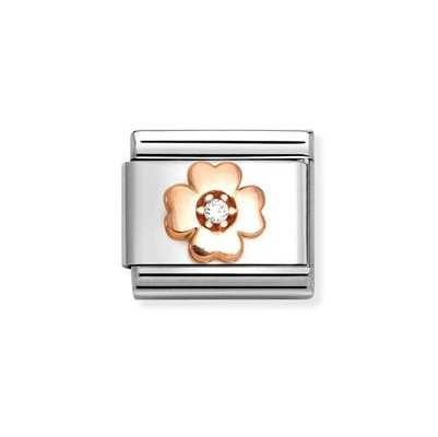 Original Nomination Classic Link in stainless steel and 9K rose gold with Four-Leaf Clover symbol with White Cubic Zirconia. Made in Italy. Choose this Link to wish someone the best of luck!