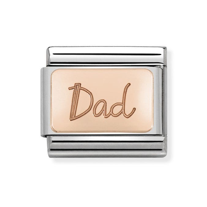 Original Charm for Nomination's Composable Classic bracelet in stainless steel and bonded rose gold with “Dad” engraved. Made in Italy. The new Composable line celebrates the most important people in your life! Would make a wonderful Father's Day gift.