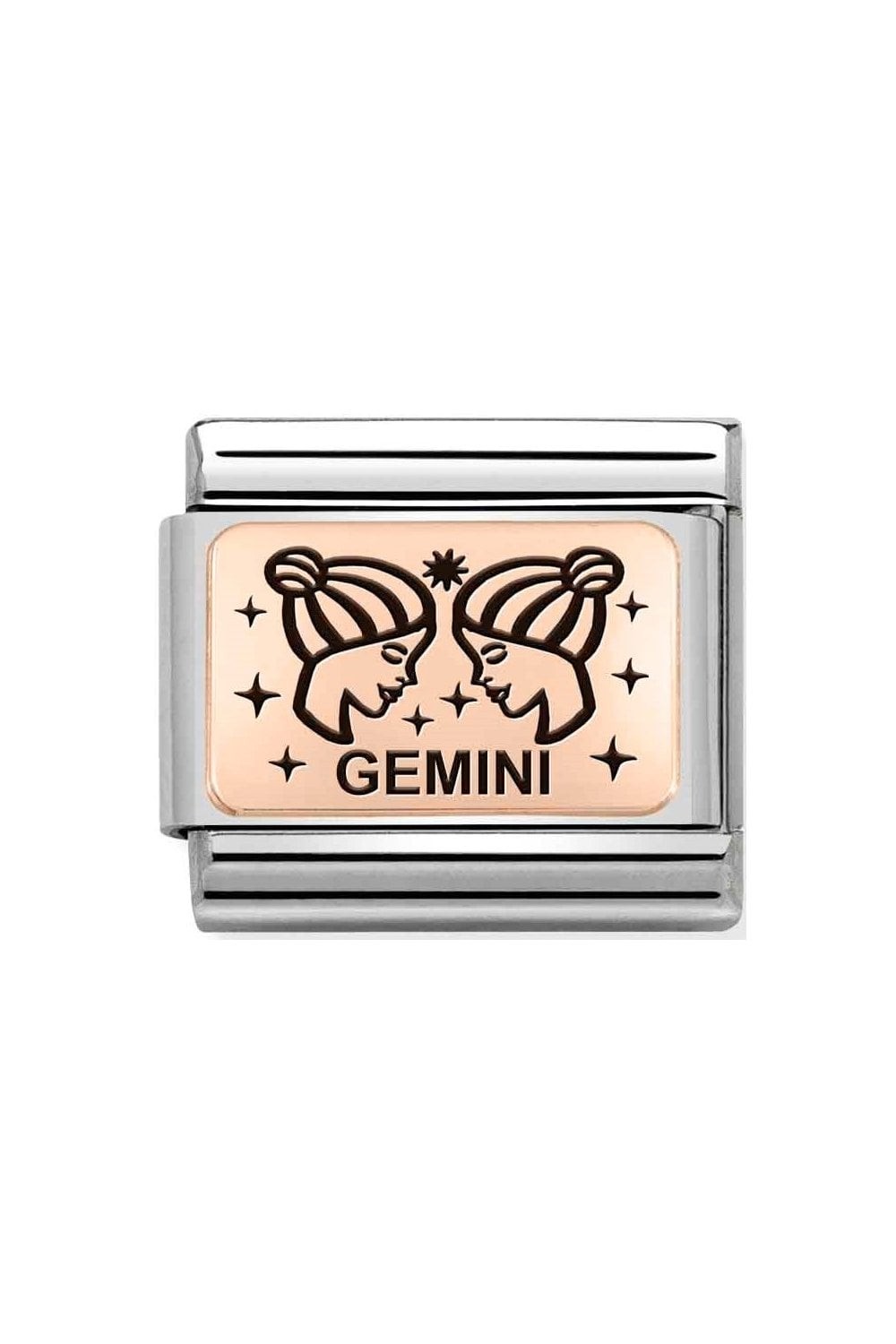 Original Nomination Link for Composable Classic Bracelets in stainless steel and 9K rosegold and Black enamel and GEMINI Zodiac symbol. Made in Italy. This Link is for Gemini - both curious and bright! Give this new brilliant link to someone who shines.