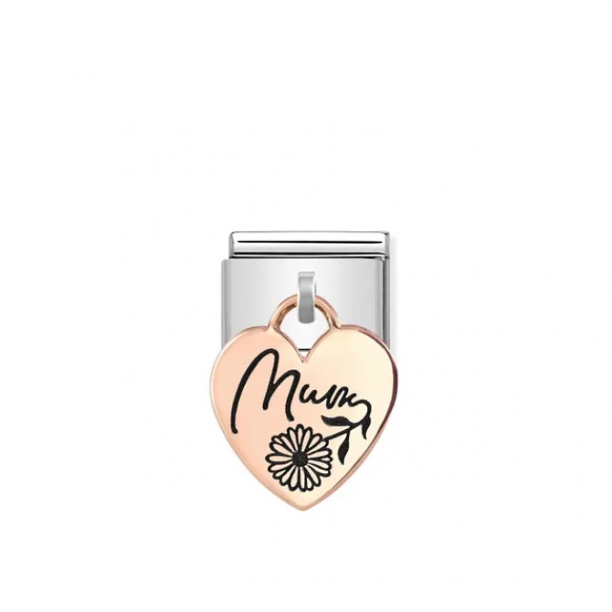 Original Nomination Classic Link in stainless steel and with 9K rose gold Heart pendant with MUM text and flower design in black engraving. Made in Italy. This gift is the perfect gift for your favourite gal: Mum!