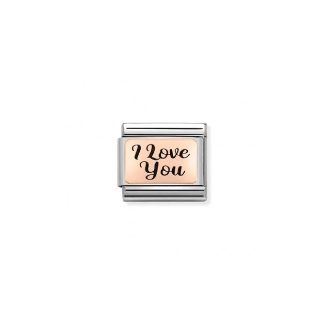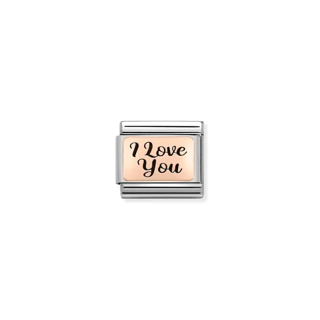 Original Nomination Classic Link in stainless steel and 9K rose gold with text I LOVE YOU. Made in Italy. The perfect Link to add to your bracelet to capture the deepest of sentiments.