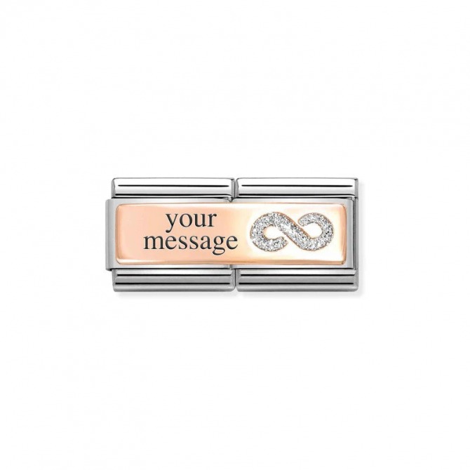 Original Nomination Classic Double Link in stainless steel with bonded rose gold Engraving Plate with Glitter Infinity. This Link can be engraved with a personal message or a drawing made but hand to make for a very personal and precious piece of jewellery. Celebrate all that you love with Nomination jewellery!