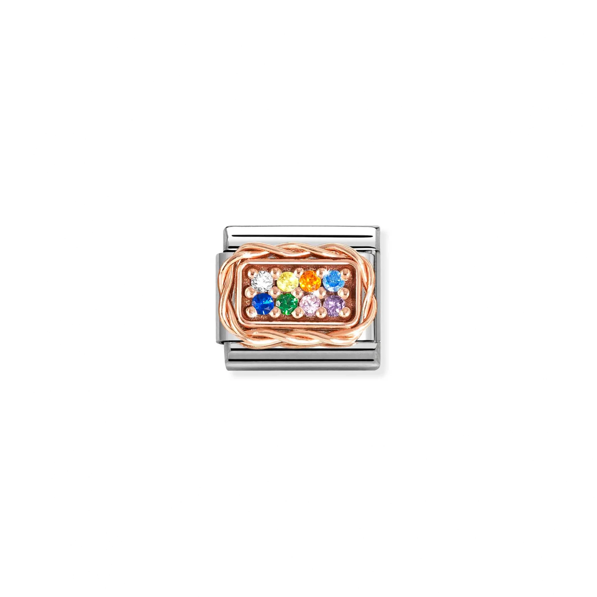 Original Nomination Classic Link in stainless steel and 9K rose gold with Rainbow Cubic Zirconia pavé. The coloured Cubic Zirconia used in this item may be subject to very slight variations in colour. Made in Italy. This Link is perfect for all the Dreamers!
