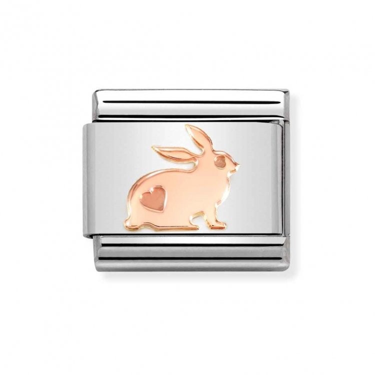 Original Nomination Classic Link in stainless steel and 9K rose gold with Rabbit with Heart symbol. Made in Italy. The new edition of the Composable Rose Gold Collection has a vast array of Links with symbols: animals, good fortune and positivity - Choose your favourites.