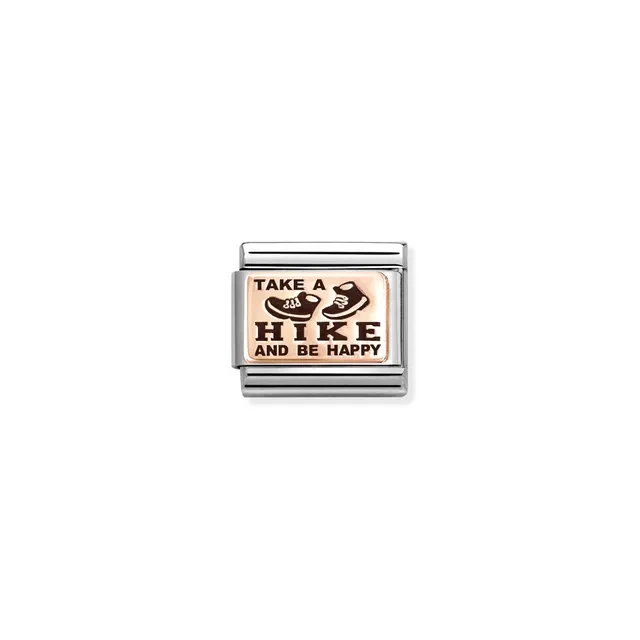Original Nomination Classic Link in stainless steel and bonded rose gold decorated plate with TAKE A HIKE AND BE HAPPY with Boots in black enamel. This Link is for lovers off the outdoor life, sports and nature and is perfect for anyone who does not want to be penned in by 4 walls.