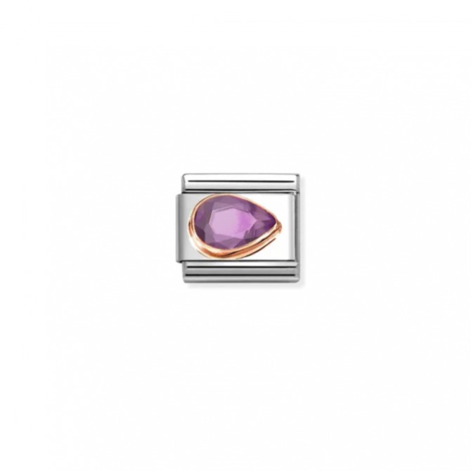 Original Nomination Classic Link in stainless steel and 9K rose gold with Violet Cubic Zirconia Drop, Right. You can also pair it with the matching Left Drop Link. The coloured Cubic Zirconia used in this item may be subject to very slight variations in colour. Made in Italy. Make you bracelet even more beautiful with your dream gems!