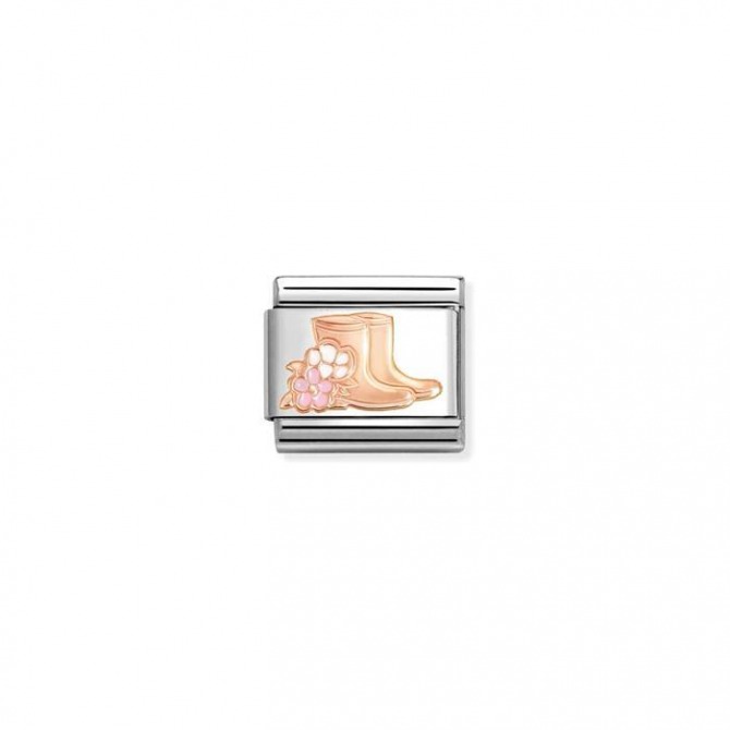 Original Nomination Classic Link in stainless steel with Wellies symbol in bonded rose gold with flowers. Coloured enamel applied by hand. This Link is perfect for anyone who loves taking care of plants and gardens.