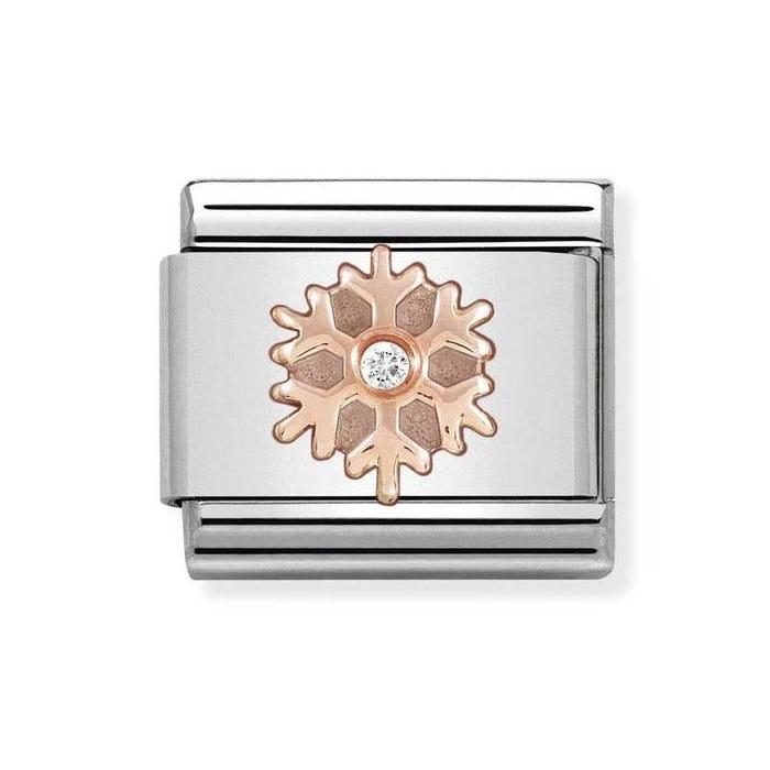 Link for Original Composable Classic Bracelet in Stainless Steel with Snowflake symbol in bonded rose gold and white Cubic Zirconia. Made in Italy. The perfect Link to capture the brilliance of the first Frost of the season on your bracelet.