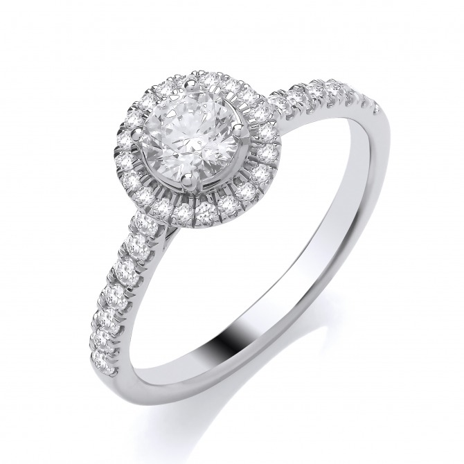 Round brilliant cut lab grown diamond with a halo cluster and stone set shoulders, mounted on a platinum ring. E. VS2 1.33ct.