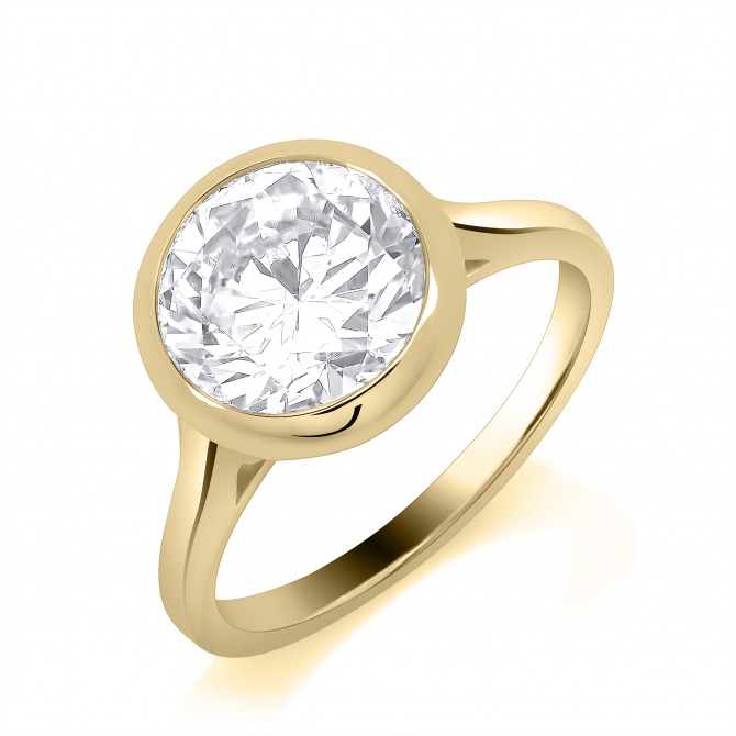 Round brilliant cut lab grown diamond in a bezel setting, mounted on a 9ct yellow gold ring. F. VS1 2.04ct.