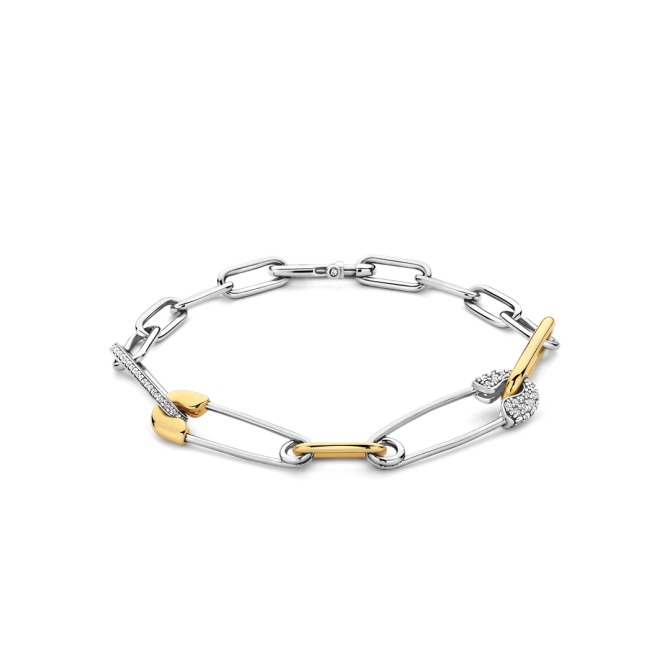 This TI SENTO gold-plated bracelet 23034ZY flaunts a stream of signature chain links including gold-plated ones and two safety pins, creating a dynamic interplay of textures and sparkle. Crafted from premium 925 sterling silver, it is coated with precious platinum to protect it from daily wear and keep it luminous. Radiant gold-plating and cubic zirconia pave add vibrancy and luxury to the design. The bracelet is a bold and sophisticated statement piece that seamlessly merges edgy design with refined elegance. Versatile and eye-catching, this bracelet effortlessly transitions from casual to formal occasions, making it a must-have accessory for the modern and trend-setting woman. Elevate your style with this signature chain link bracelet that exudes bold sophistication and moden classic charm. Like all our jewellery, this bracelet is nickel-free and hypoallergenic, promising not just style, but also comfort and quality that stands the test of time.