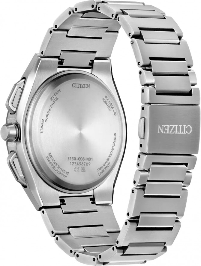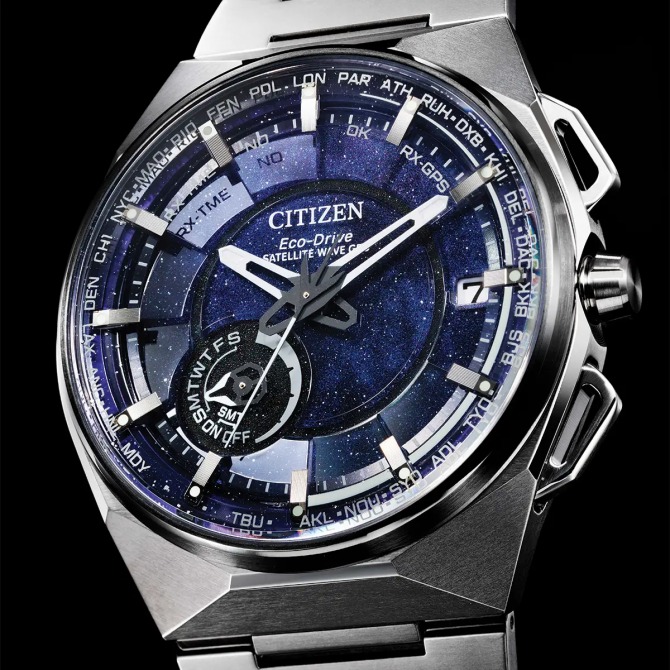 Marking ten years since the launch of the original F100 models in 2014, Citizen now introduces the Satellite Wave. Inspired by satellites and the infinite expanse of space, the new watch matches future-cool styles with the world's fastest timekeeping signal reception speed from GPS navigation. A 45mm Super Titanium™ case and bracelet solidify the distinct integrated construction of the timepiece, while a duo of pushers & a conical crown provide a sporty and avant-garde touch. A world time bezel frames the cosmos-inspired dial, with black and applied silver-tone accents adding dimensionality alongside the utility of the watch's feature-packed sub-dial and date window. Advanced features of the Satellite Wave include a satellite GPS timekeeping system with the world's fastest reception speed– as quick as 3 seconds– a world time in 27 cities (40 time zones), daylight savings time indicator, power reserve indicator, light level power indicator, and day/date displays. Water resistant up to 100 metres.