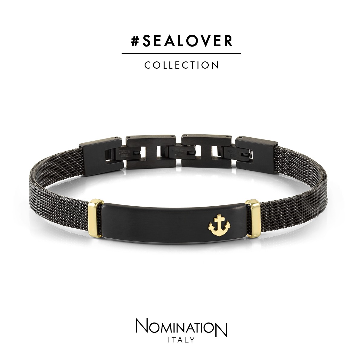 Nomination Sealover Gents Bracelet. Satin finish stainless steel with a 'Milano' mesh strap with gold coloured detail.