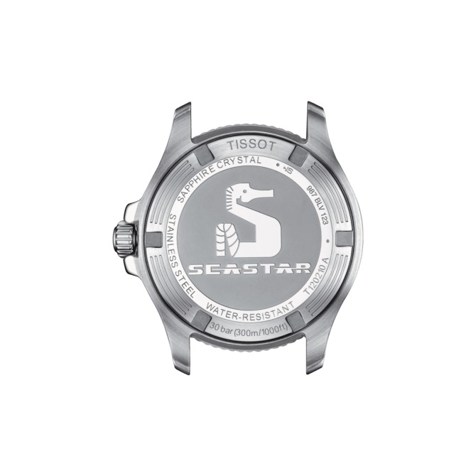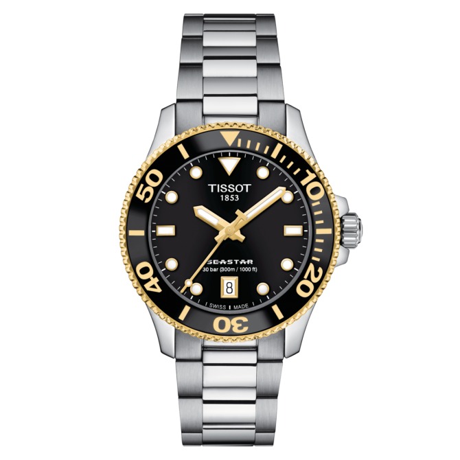 In crystal clear waters, you can see the sun rays breaking through the surface. In your mind, only calm. On your wrist, the Seastar 1000, the door to this underwater world. Chic, assertive and versatile, the new Seastar 36mm watches feature a stainless steel case and bracelet, a uni-directional rotating bezel with a mineral glass insert, a screw-down crown and water resistance up to 30 bar (300m / 1000ft). And if you want, you can quickly switch the bracelet for an orange, white, light-blue or black silicone strap. Change your outlook and step into another world with this watch featuring a black dial, contrasting bezel and stainless steel bracelet.
