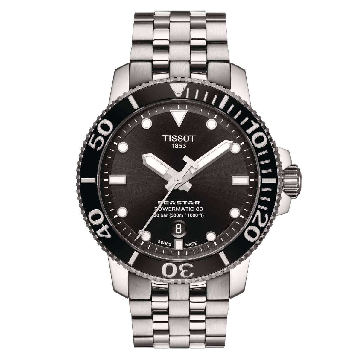 The Tissot Seastar 1000 merges style and performance without compromising either. The diving inspiration shapes both the appearance and the functionality of this watch. It maintains its performance to a pressure of 30 bar (300m/1'000ft), combining underwater sports and a preference for a sophisticated Swiss timepiece. The diving theme continues through elements such as a unidirectional bezel, a strap with a divers' safety buckle, plus luminescent hands and markings. Discover this version with its black dial with matching bezel and stainless steel bracelet.