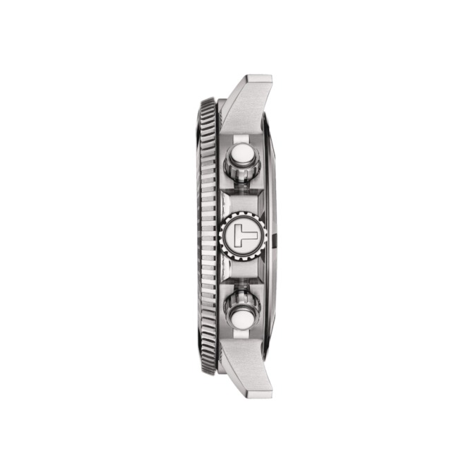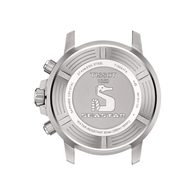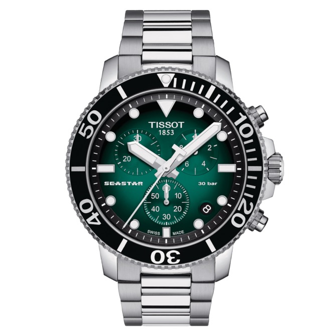 The Tissot Seastar watch from the T-Sport collection combines a 45.5mm round shaped stainless steel case and silver stainless steel bracelet with a fold over clasp fitted with safety and a diver extension. It has a green gradient analogue dial which is protected beneath sapphire crystal glass with an anti-reflective coating. Power is generated by a 13 1/4" Swiss quartz EOL movement with a Renata 394 battery. This model also has a water resistance of up to 300 metres.