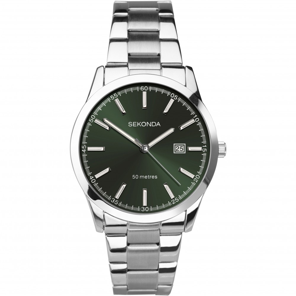This Sekonda watch combines a 41mm round-shaped metal alloy case and silver stainless-steel bracelet with a push-button deployment clasp. This classic watch features a dark green sunray analogue dial, with two silver luminescent hands and a second tracker. The date is visible at position 3 with a white border which is protected beneath mineral crystal glass. Power is generated by the quartz movement. This model also has a water resistance of up to 50 metres.