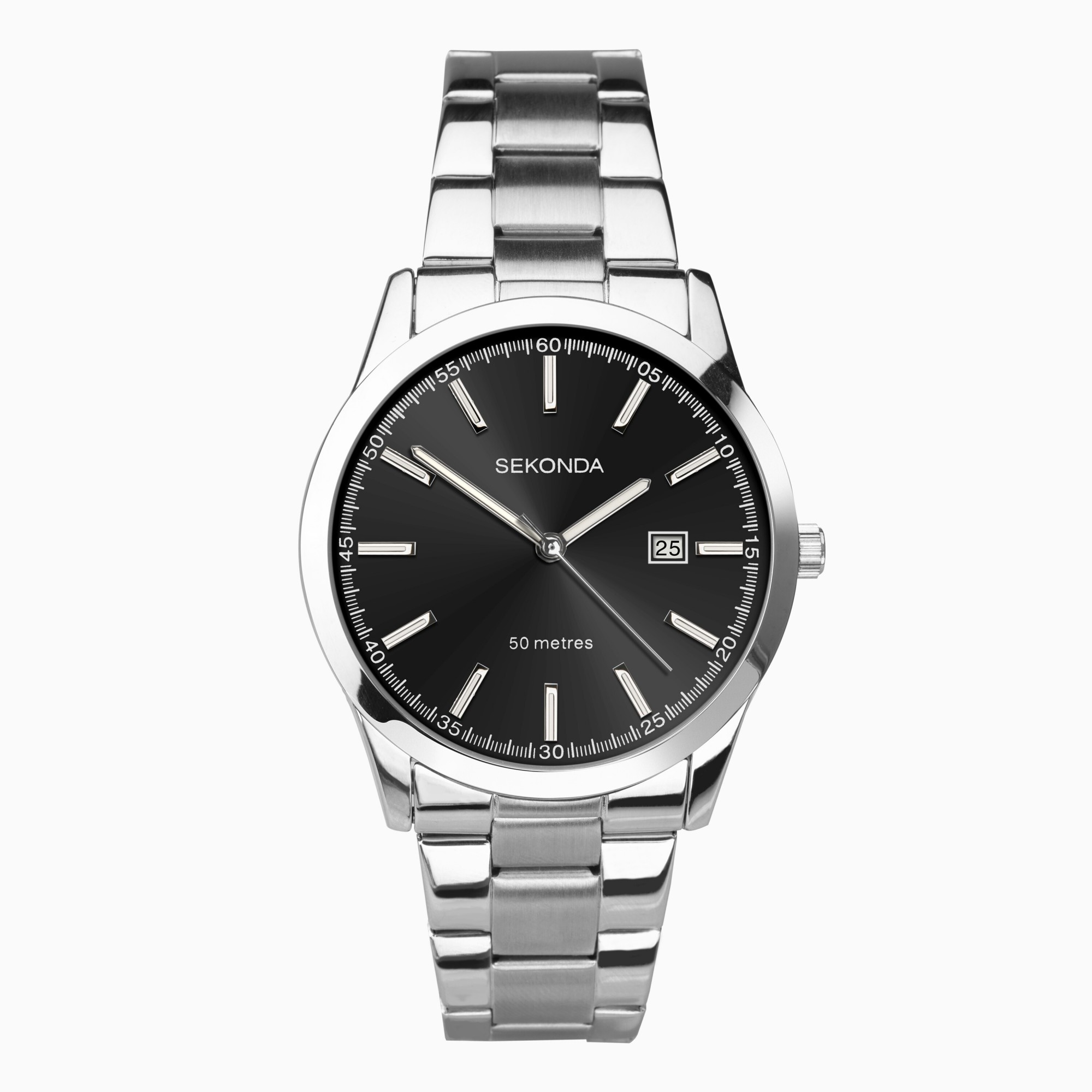 This stylish watch combines a 41mm round-shaped metal alloy case and silver stainless-steel bracelet with a push-button deployment clasp. This classic watch features a black sunray analogue dial, with two silver luminescent hands and a second tracker. The date is visible at position 3 with a white border which is protected beneath mineral crystal glass. The watch contains a quartz movement. This model also has a water resistance of up to 50 metres.