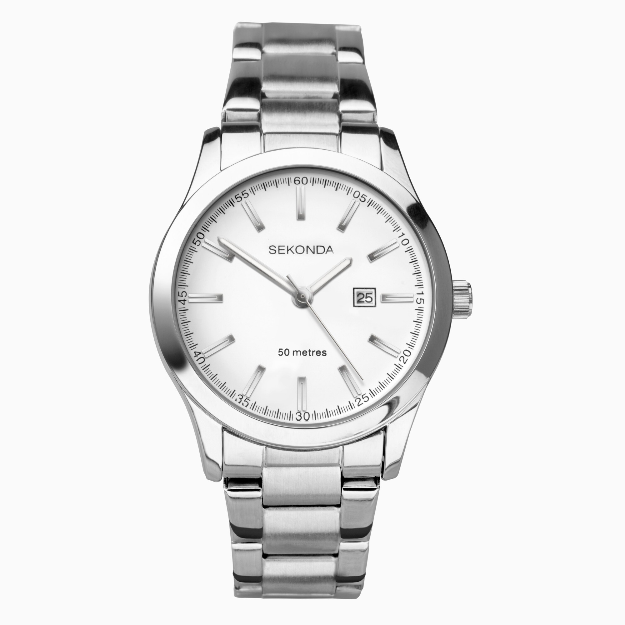 This watch features a round, silver coloured case housing a white dial with a date display. Fastened with a stainless steel bracelet and is water resistant up to 50 metres.