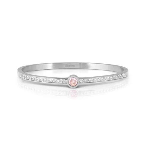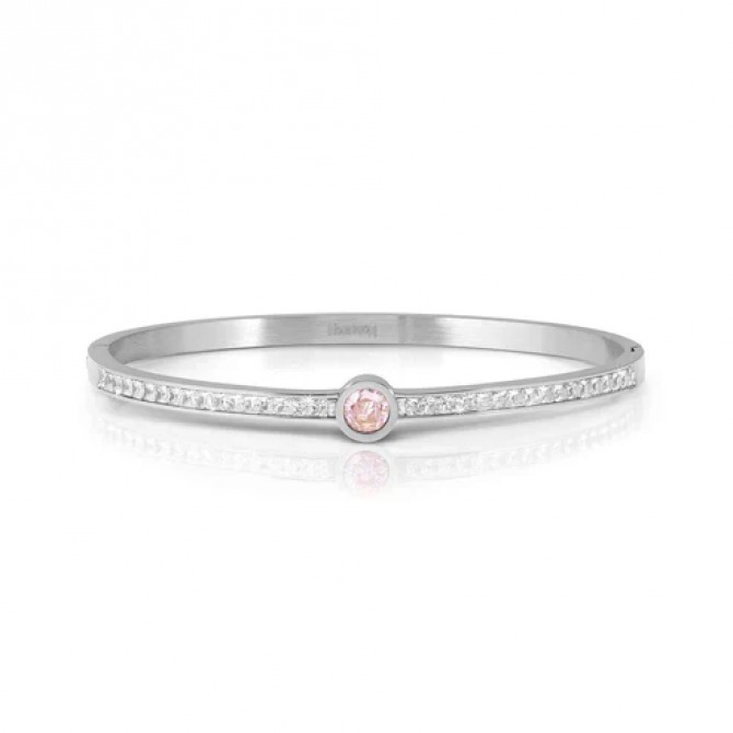 Stainless steel bangle bracelet with White Cubic Zirconia and White or Pink central Cubic Zirconia. Each bangle is hinged on one side and has a hidden fastening that snaps securely closed on the other. Teenagers are not the only ones who love bangle bracelets! These are the perfect jewellery item for anyone who wants a fun, joyful look. This accessory is perfect for so many situations and look and is a Must Have for anyone who likes to change up their look with a focus piece.