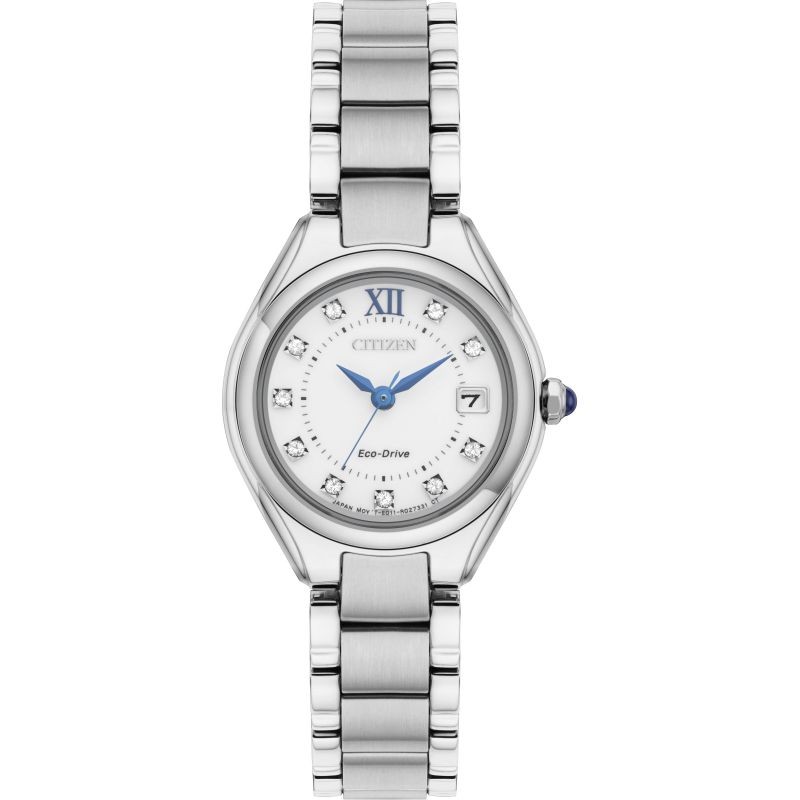 A classic watch from the Citizen Silhouette Collection has a stainless steel bracelet with a white face, striking blue hands & a date indicator. It is water resistant to 50m. This watch uses Eco-Drive technology and is powered by light – any light. It never needs a battery. All Citizen Watches come with a five year manufacturer guarantee.