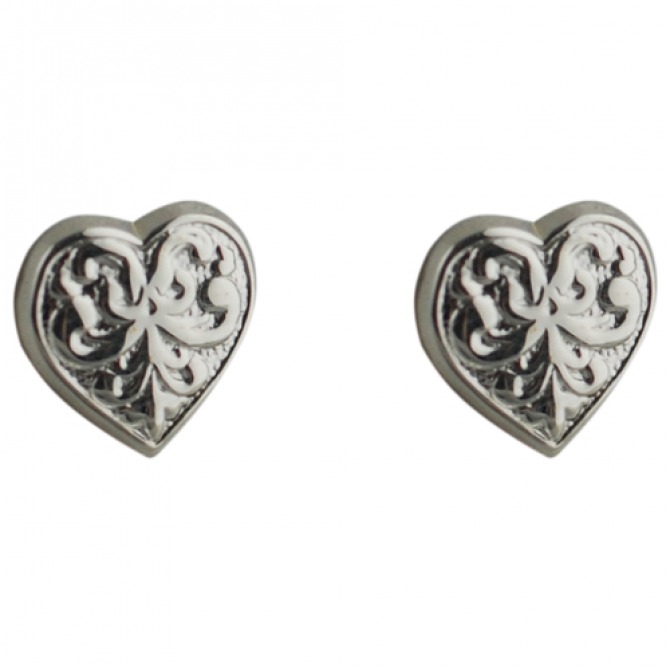 Sterling Silver 10x10mm embossed scrolls pattern heart shaped stud Earrings. Made and hand polished in our Birmingham factory. Please note due to the Handmade nature of this product weights, dimensions & measurements can slightly vary.