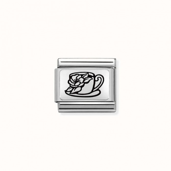 The Teacup with Flowers charm features a sterling silver plate with a teacup motif and a fancy floral design in black enamel detailing which is set on a stainless-steel base.
