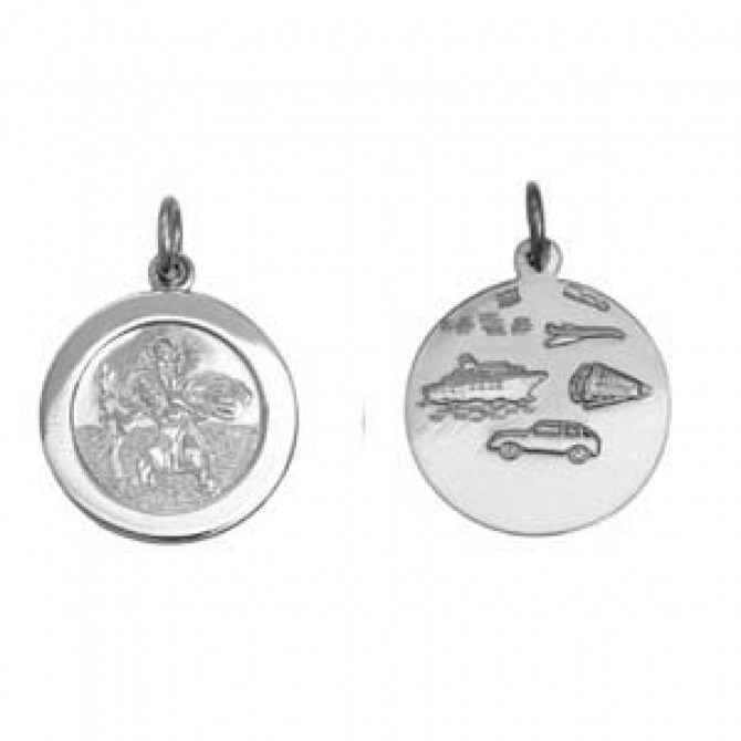 Sterling Silver 21mm round plain Saint Christopher pendant with a car, airplane, train and ship stamped on the back leaving enough room for a few engraved intials. It is stamped from 1 mm thick sheet. Handmade and hand polished in our Birmingham factory. Please note due to the Handmade nature of this product weights, dimensions & measurements can slightly vary.