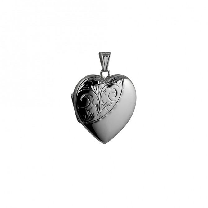 Sterling Silver 30x28mm half hand engraved open scroll pattern heart locket, hand engraved in the top left hand corner, the remainder left plain. Handmade and hand polished in our Birmingham factory. Please note due to the Handmade nature of this product weights, dimensions & measurements can slightly vary.