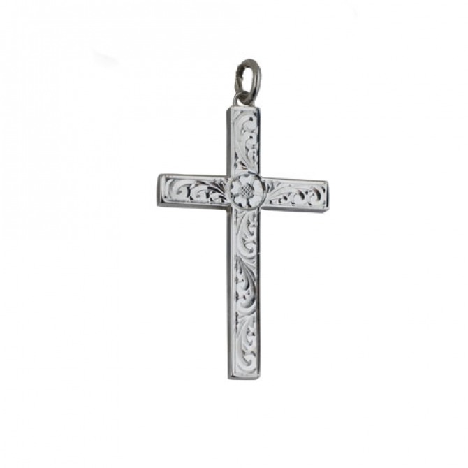 Sterling Silver 40x25mm Victoria hand engraved solid block Cross, the front is covered with ornate reproduction victorian hand engraving. Handmade from 4.5 mm by 3.5 mm rectangular wire, the back and sides are plain highly polished. Handmade and hand polished in our Birmingham factory. Please note due to the Handmade nature of this product weights, dimensions & measurements can slightly vary.