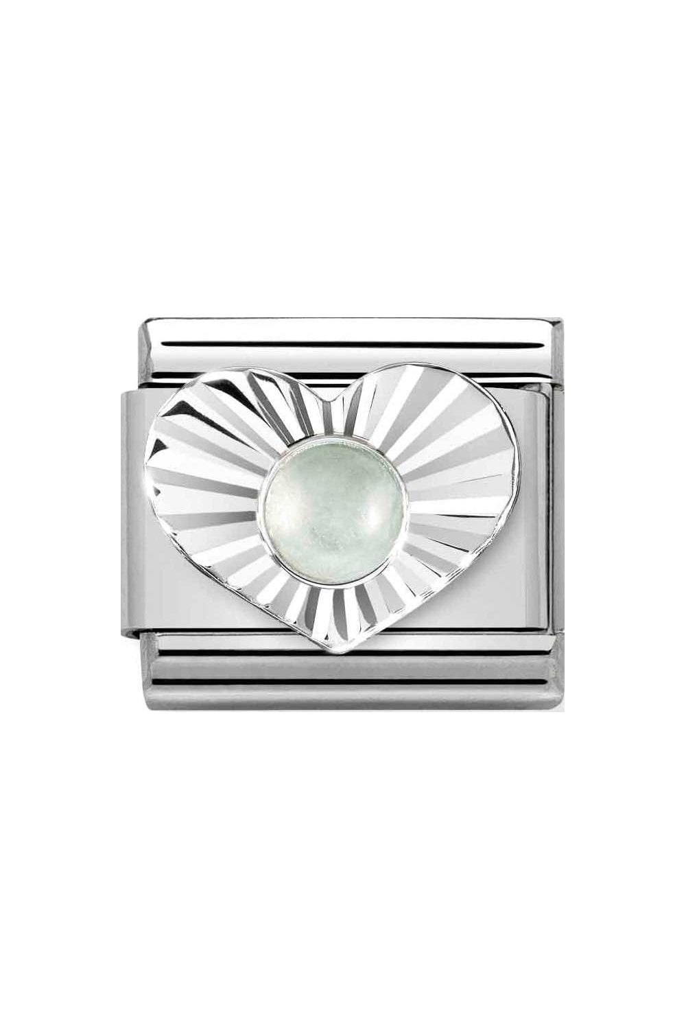 Original Nomination Link for Composable Classic Bracelets in stainless steel with sterling silver Heart and Milky Aquamarine. Made in Italy. This stone is a symbol of love and serenity - the best gift for someone who is about to tie the knot.
