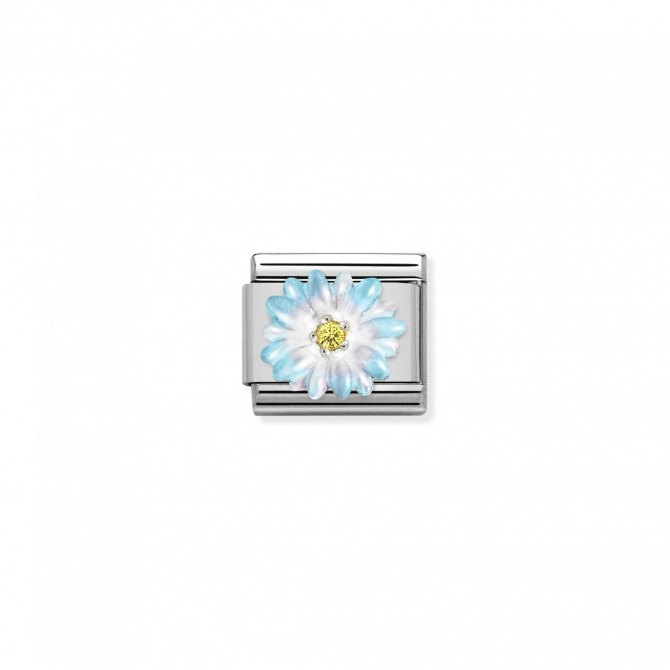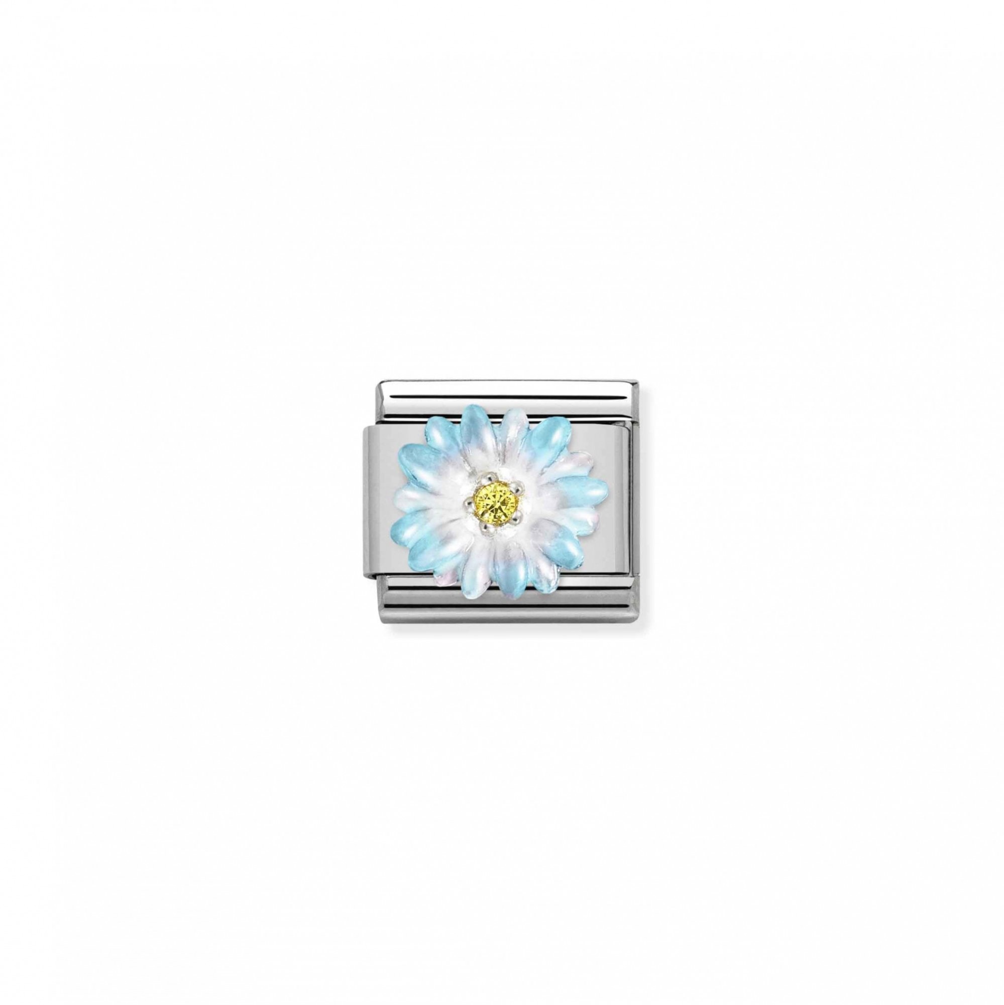 Original Nomination Link for Composable Classic Bracelets in stainless steel and sterling silver with Flower symbol with Light Blue enamel and Yellow Cubic Zirconia. Made in Italy. Choose this flower Link to tell someone “I love you”.