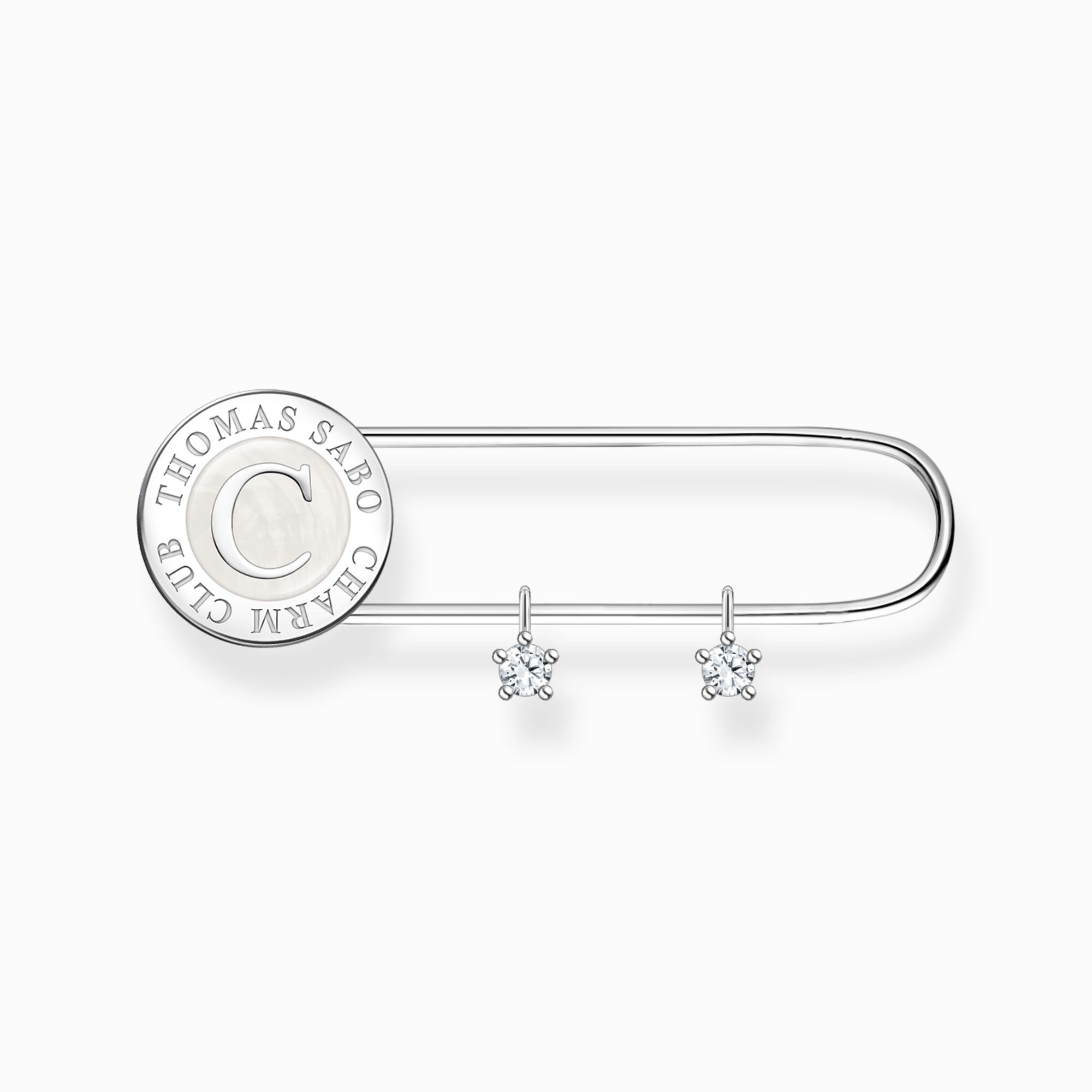 Charm carrier: the brooch made of high-quality 925 Sterling silver is inspired by a safety pin. It is adorned with two little pendants that are embellished with one zirconia stone each. A special highlight: the chain’s lock comes in the shape of the THOMAS SABO Charm Club Charmista Coin. The latter is hand-painted with shimmery white cold enamel. For individual looks, you can combine the brooch with selected charms.