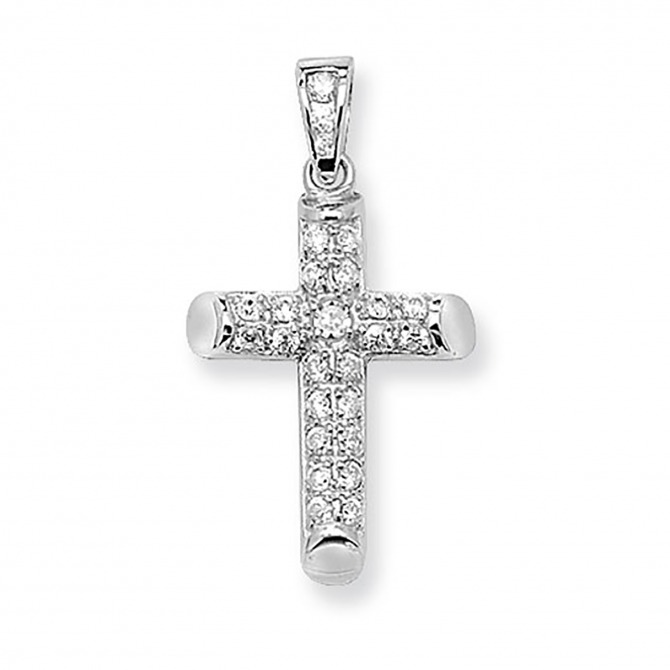 Sterling silver cross pendant set with cubic zirconia.