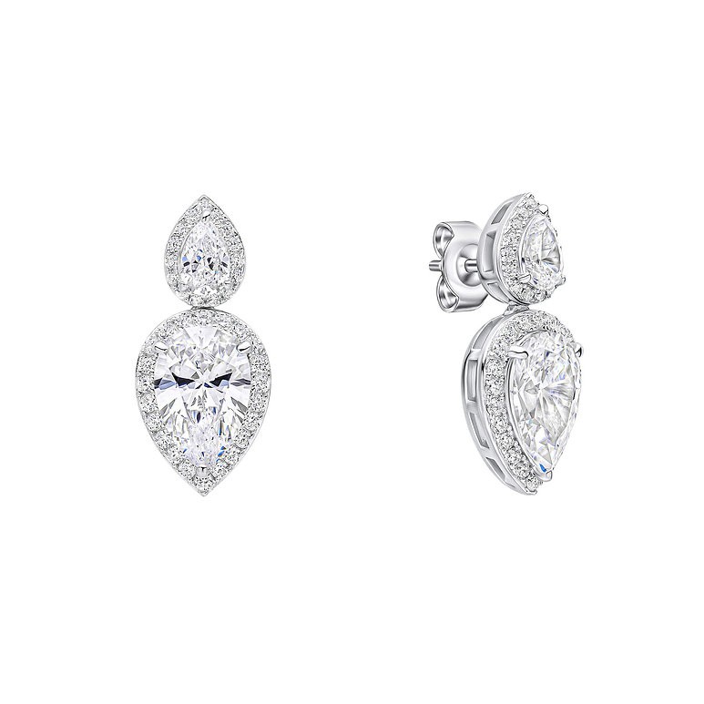 Make a dazzling statement with these stunning drop earrings, designed to exude glamour and elegance with every movement. Featuring two teardrop shaped Diamonfire zirconia stones, each encased in a sparkling halo, these earrings catch the light from every angle. Crafted from sterling silver with a triple plating of platinum, palladium, and rhodium, these earrings offer a radiant finish that lasts. The fluid drop design enhances their brilliance, making them the perfect choice for black-tie events, weddings, or any occasion where only the most sophisticated sparkle will do, especially when worn with the matching necklace.