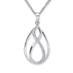 Sterling silver open teardrop pendant which contains an infinity symbol which is set with cubic zirconia. The pendant sits on a sterling silver 18" chain.