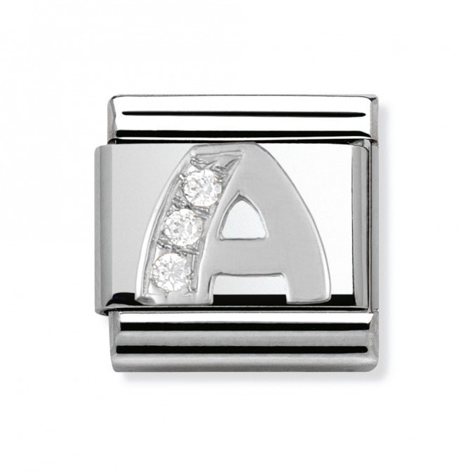 Original Alphabet Charm for Nomination's Composable Classic Bracelet with Letter A in stainless steel, sterling silver and Cubic Zirconia. Available Charm versions: A-Z. Made in Italy. The perfect birthday gift.