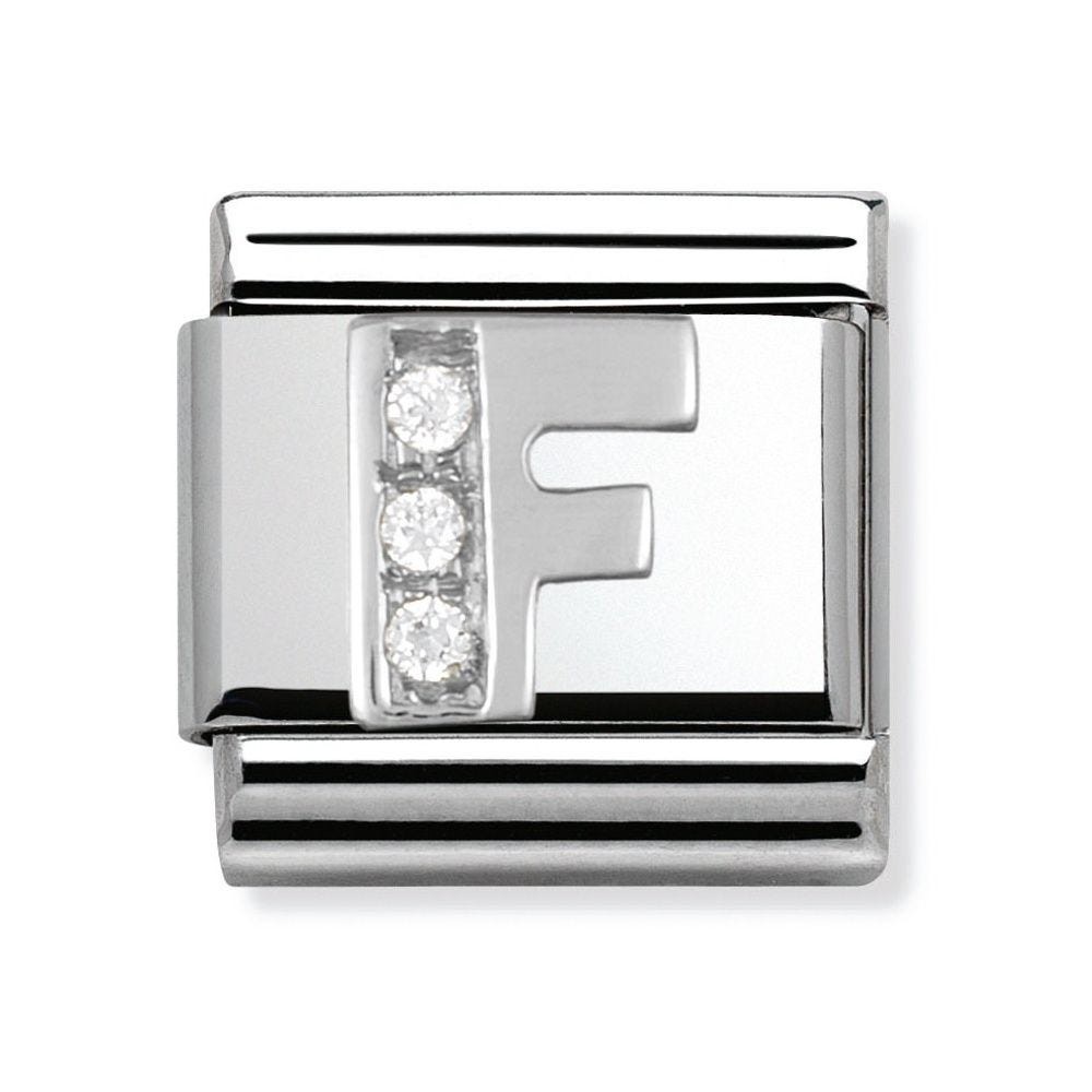 Original Alphabet Charm for Nomination's Composable Classic Bracelet with Letter F in stainless steel, sterling silver and Cubic Zirconia. Available Charm versions: A-Z. Made in Italy. Add your loved one's initials to your bracelet!