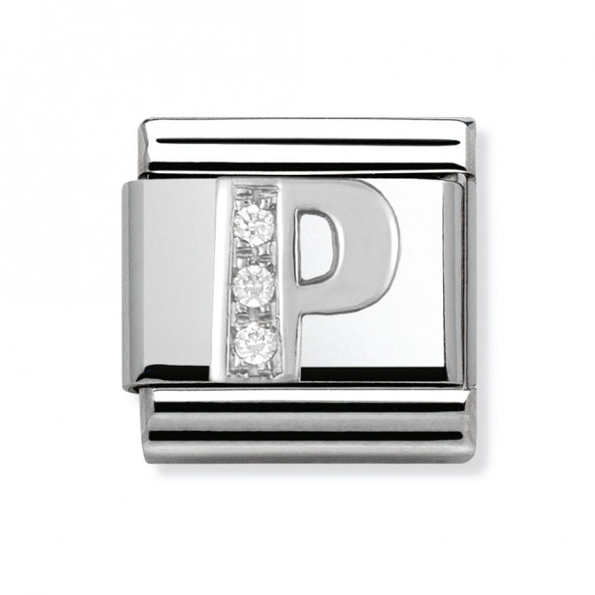 Original Alphabet Charm for Nomination's Composable Classic Bracelet with Letter P in stainless steel, sterling silver and Cubic Zirconia. Available Charm versions: A-Z. Made in Italy. Give your initials to the people you love.